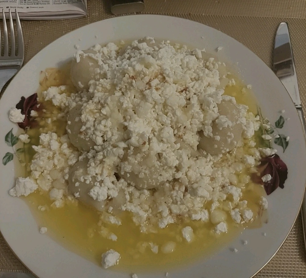 Tvarohové knedlíky s meruňkou, tvarohem, cukr moučka a másílko.