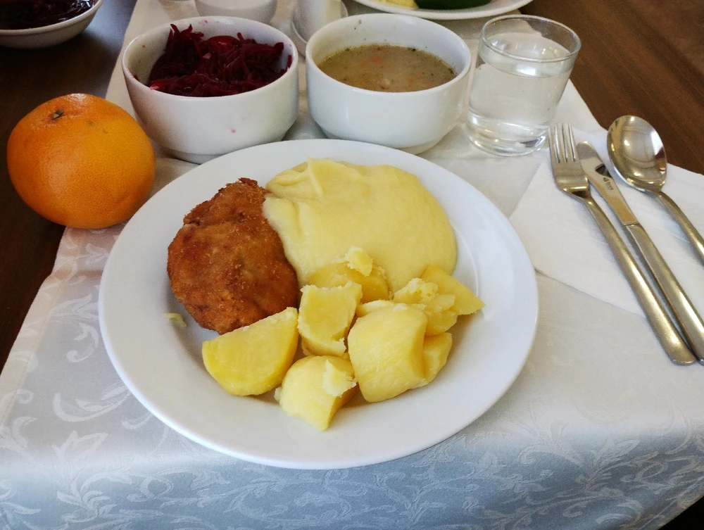 Řízek s bramborem,červená řepa a polévka.Jsem full