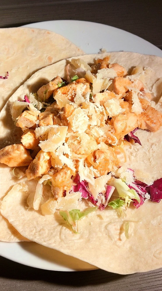 Rychlá večeře. Kuřecí tortila. Ve dvou se to lépe motá a udrží (life hacks). Kuřecí prsa osmahnutá na oleji na cibulce. Nějaké to koření. Zbytek salátu z lednice. A sýr grana padano v přesně takovém množství, dokud chuťové buňky neřeknou dost. 😜