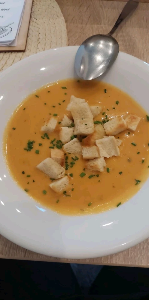 Polévka: Krém z pečené zeleniny s krutony.