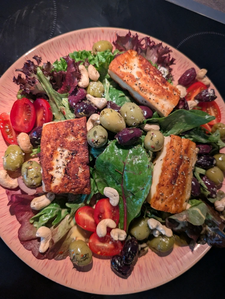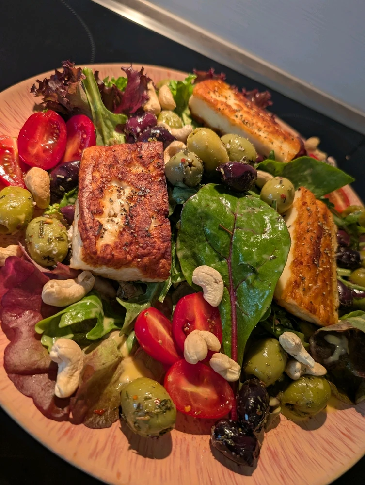 Blattsalat mit selbstgemachtem Mango Chili Dressing Halloumi, Oliven, Tomaten und Cashewnüssen