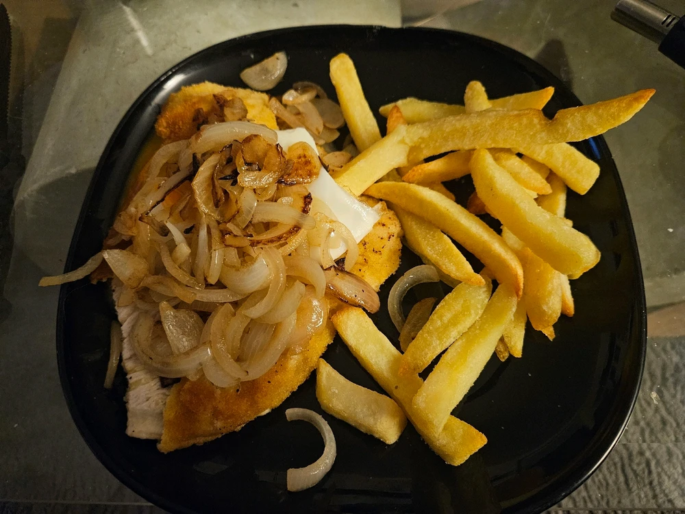Schnitzel mit Spiegelei und angebratenen Zwiebeln 😋