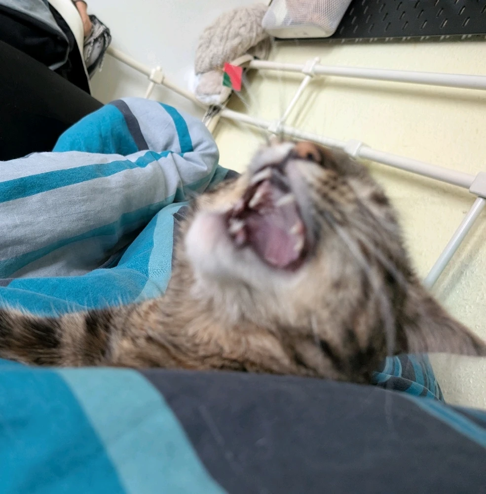Hier sehen sie ein weibliches Exemplar einer Kadse mit dem Namen Mimi. Dieses Exemplar positionierte sich eines Morgens auf den Beinen ihres Haus-Menschen (der bin ich). Daraufhin gähnte sie mehrfach, trotz auf sie gerichtete Kamera. Diese Bilder zeigen die drei Phasen eines Kadsen Gähners: das... mehr lesen