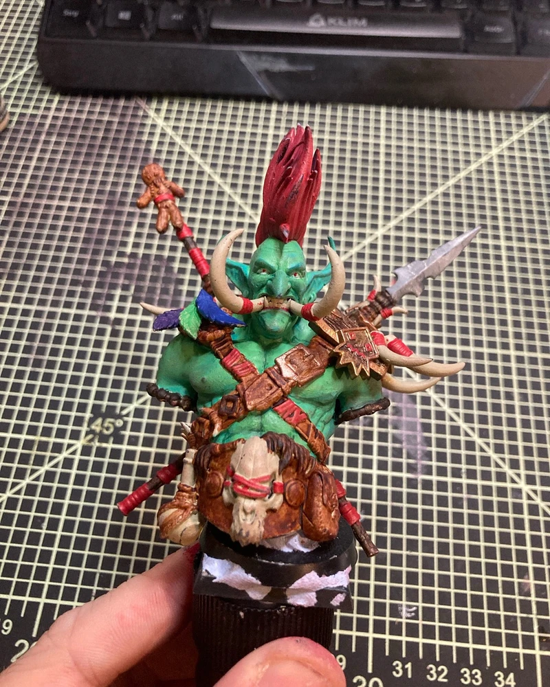 Soweit bin ich ganz zufrieden. Ich muss noch ein bisschen die Haare fixen, sowie mehr Schatten an zB den Hauern und Schädel einbringen. Und die Potion braucht noch Farbe
