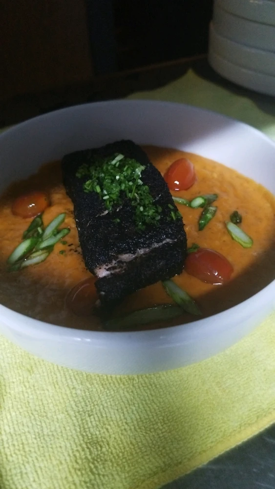 Salmón en ceniza de brioche, sobre una cama de Risotto, tomate cherry y espárragos salteados