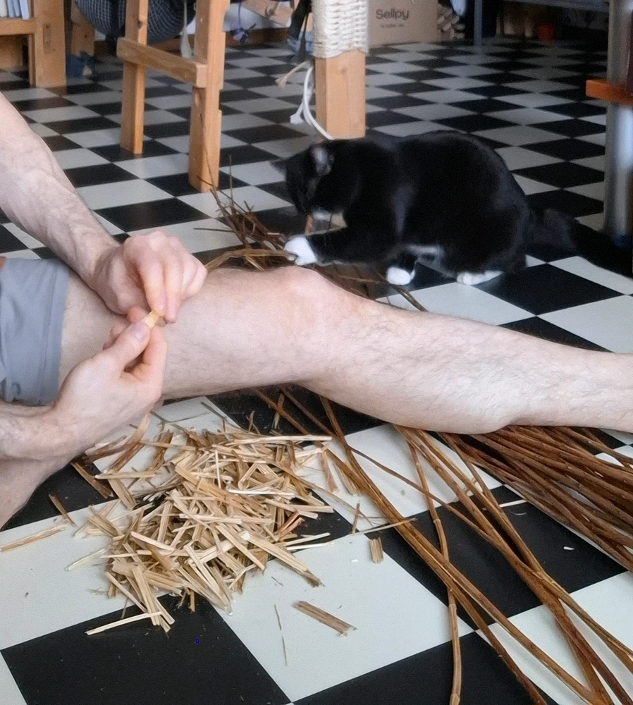 Businka me ayuda a separar la corteza de adelfillas y da el visto bueno al progreso de mi estantería. (editado)