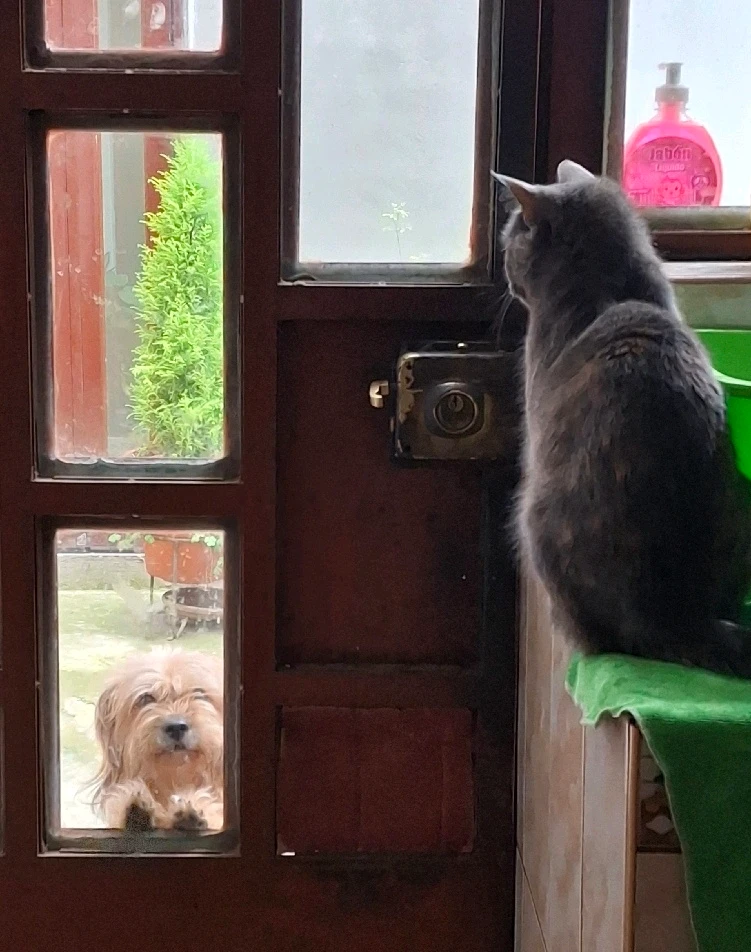 Lo cerraron para q coma afuera...y luego no habia quien le abriera...el gato se le quedo mirando