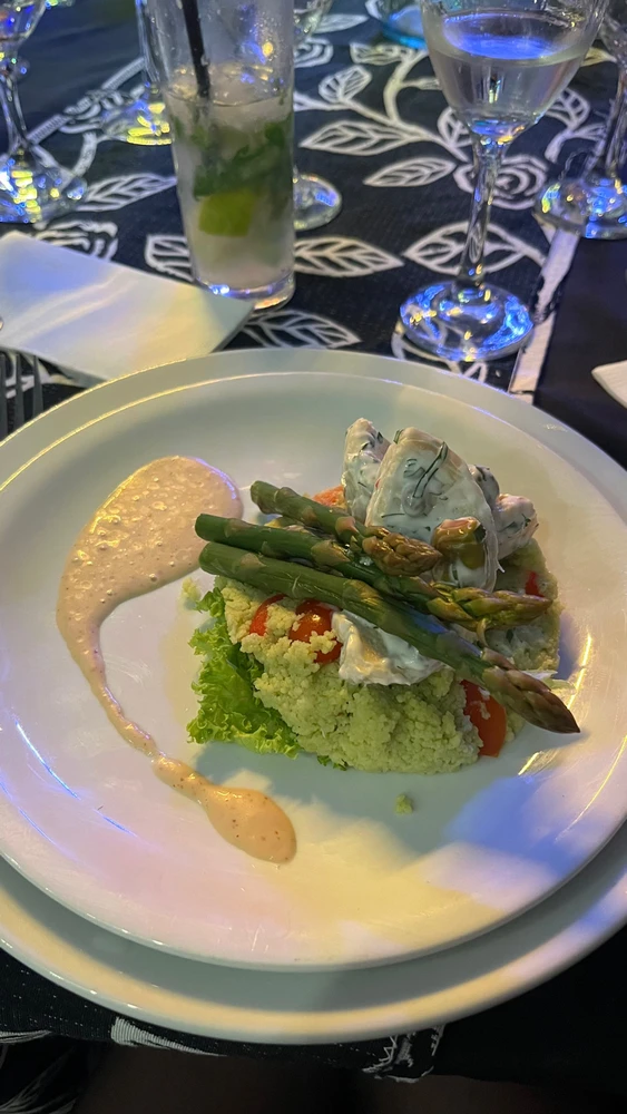 Hace una semana para el día del profe, a los hervíboros nos sievieron este plato de couscous con espárragos y fondos de alcachofa a la crema (#vegan obvio). De plato fuerte era un champiñón gigante relleno con pasta y palta fileteada sobre una cama de lechuga y aceitunas. Se lucieron los chefs!