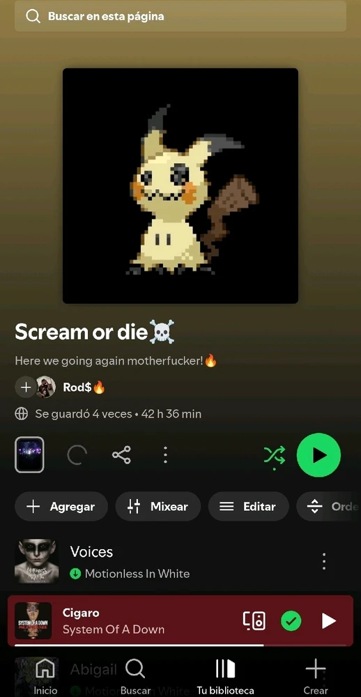 Mi playlist de spoty, dedicada al rock y metal, un poco más al metal y subgéneros🖤 me gustaría ampliarla un poco, así que venga dejen alguna recomendación De paso, top 5 de bandas favoritas, no de favorita a menos favorita cabe aclarar 1- Avenged Sevenfold 2- Metallica 3- Slipknot 4- Pierce... leer más