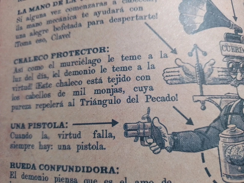 Acabo de leer el libro de Bill y hay una sección donde intentan un grupo de personas armarse contra el dorito malvado, así que alistaron esto: - Pelo de monja para cuidarse del demonio😇 - Una pistola por si falla lo anterior ☠️
