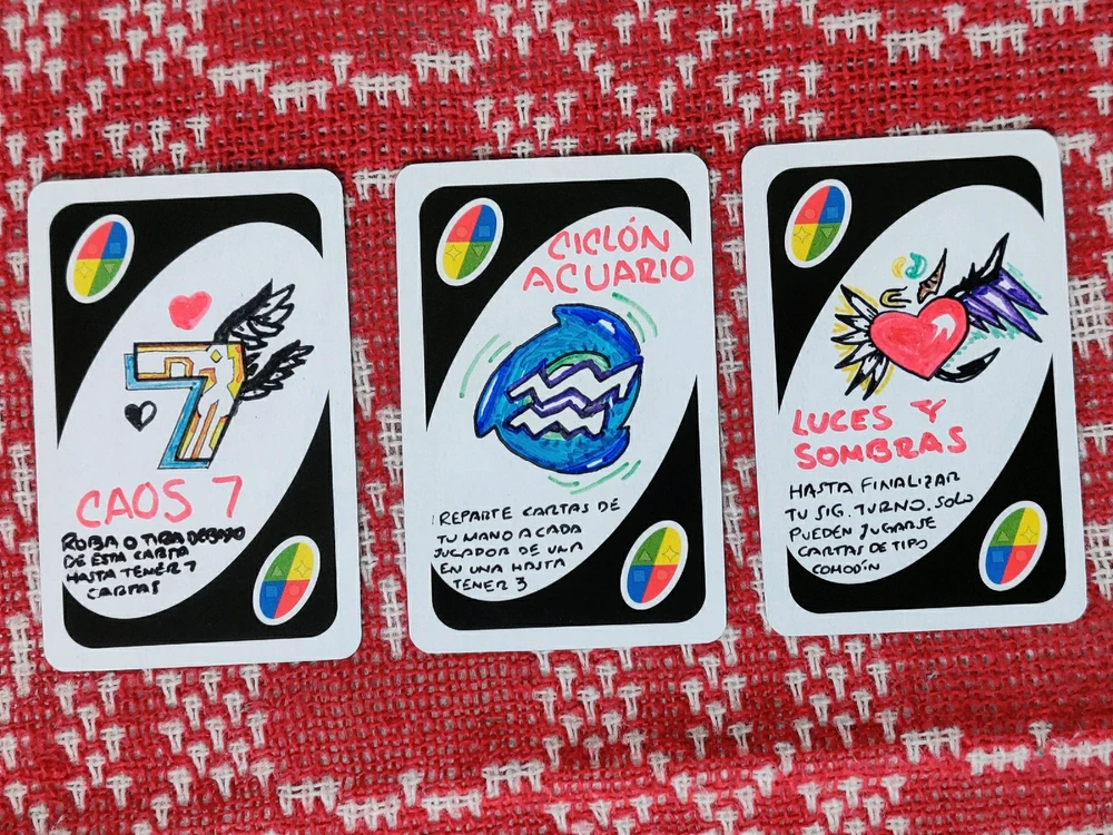 Mis segundas ideas CAOS 7: Roba o tira debajo de está carta hasta tener 7 cartas CICLÓN ACUARIO: Reparte cartas de tu mano a cada jugador de una en una hasta quedarte con 3 LUCES Y SOMBRAS: Hasta finalizar tu siguiente turno, solo pueden jugarse cartas del tipo comodín (editado)