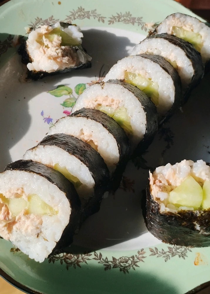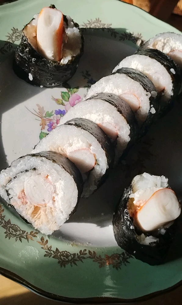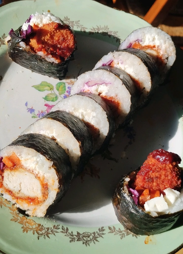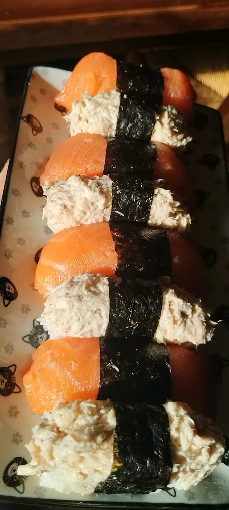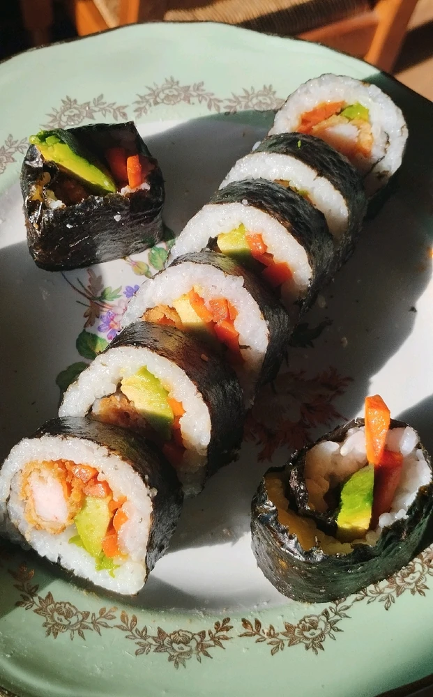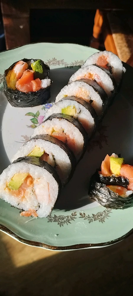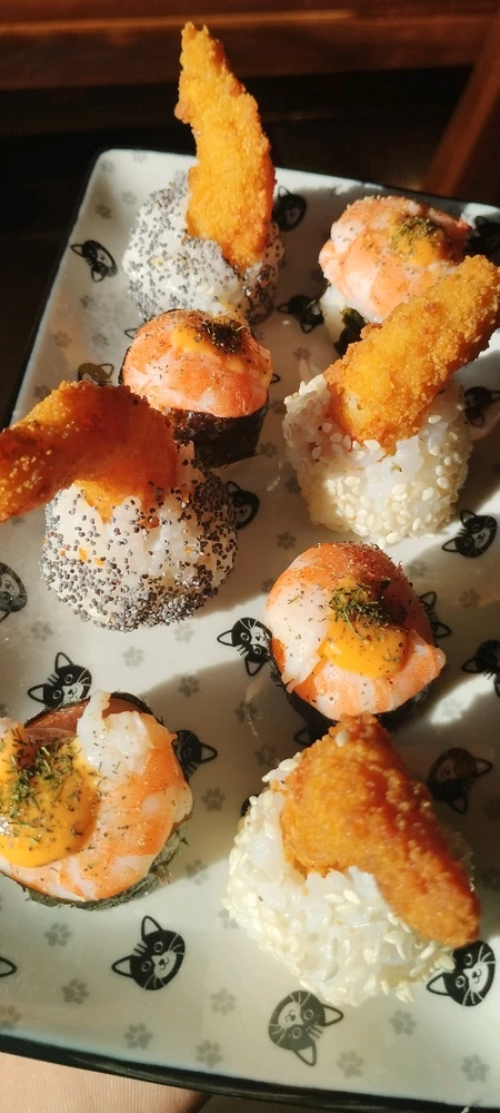 1- Sushis saumon et thon mayo 2- Sushi balls crevettes et crevettes panées 3- Makis saumon, avocat et crevettes 4- Makis crevettes panées, avocat et carottes 5- Makis thon mayo et concombre 6- Makis coraya kiri 7- Makis Poulet frit piquant, fromage frais, chou rouge et carottes