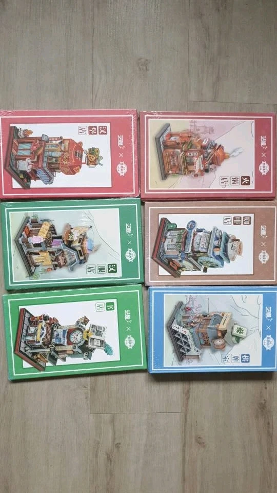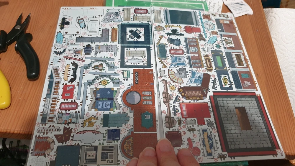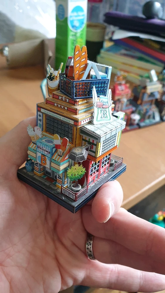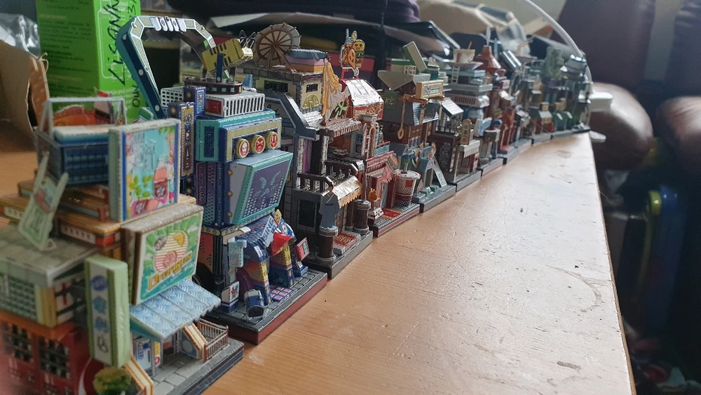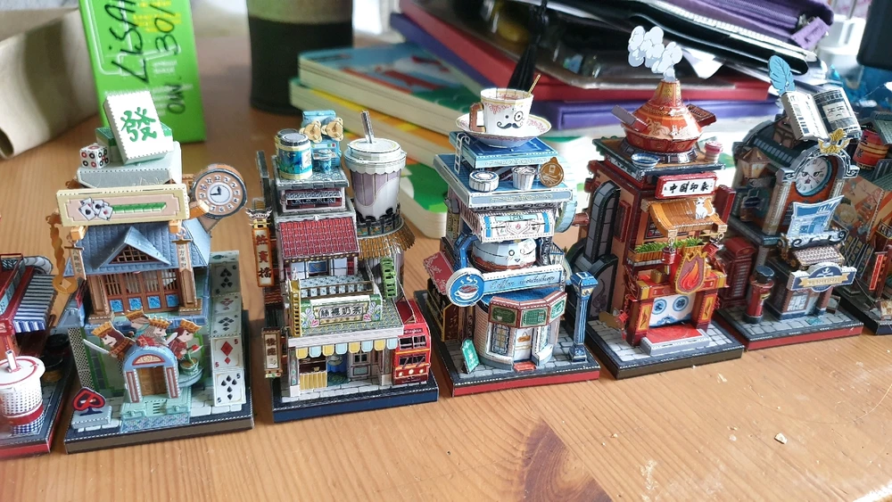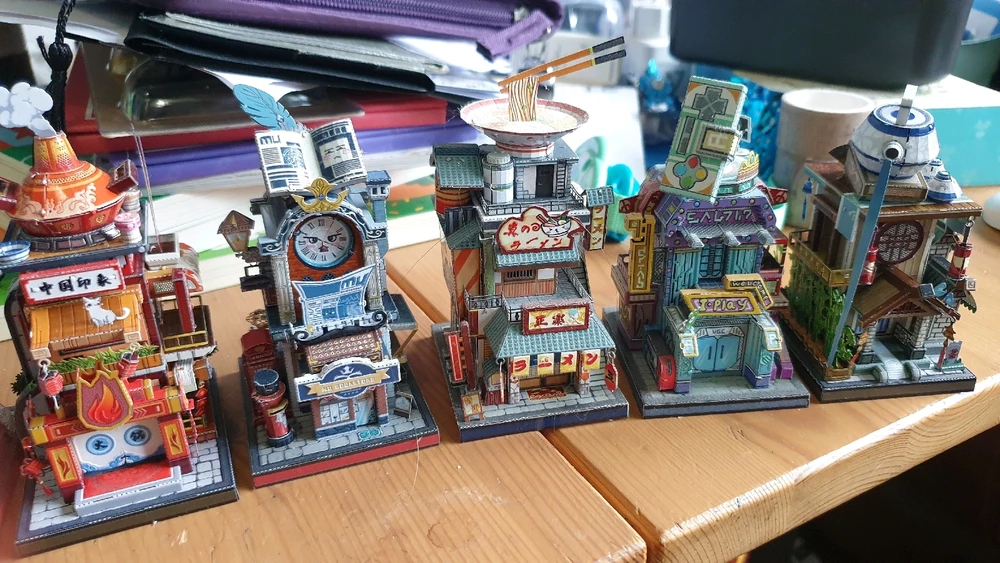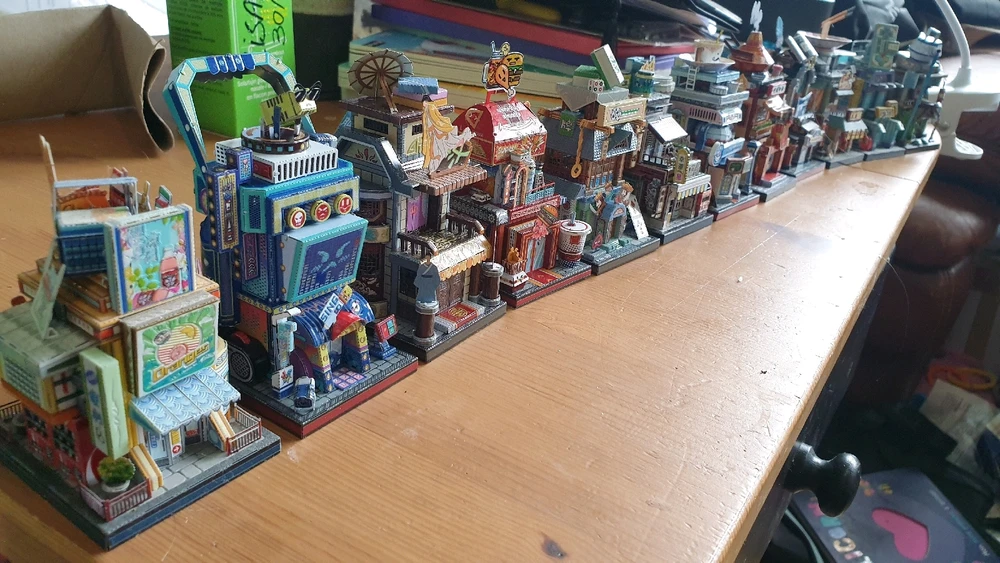 Alors aujourd'hui c'est un tir groupé … de 12 mini-maquettes ! Il s'agit d'une ville entière composée de petits bâtiments assez loufoques d'un quartier marchand. Les socles ont tous une base d'environ 5cm × 5½cm, pour une hauteur de maquette d'environ 10 cm Il faut compter à peu près 3h de montage... (modifié) en savoir plus