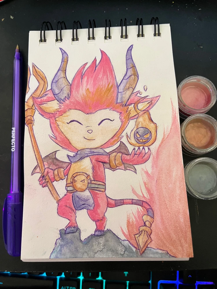 Coucou ! Voici ma toute première aquarelle ! J’ai fais Teemo Diablotin ! 😈 Plutôt contente du résultat pour une première, j’ai acheté la peinture à Action ! 🎨