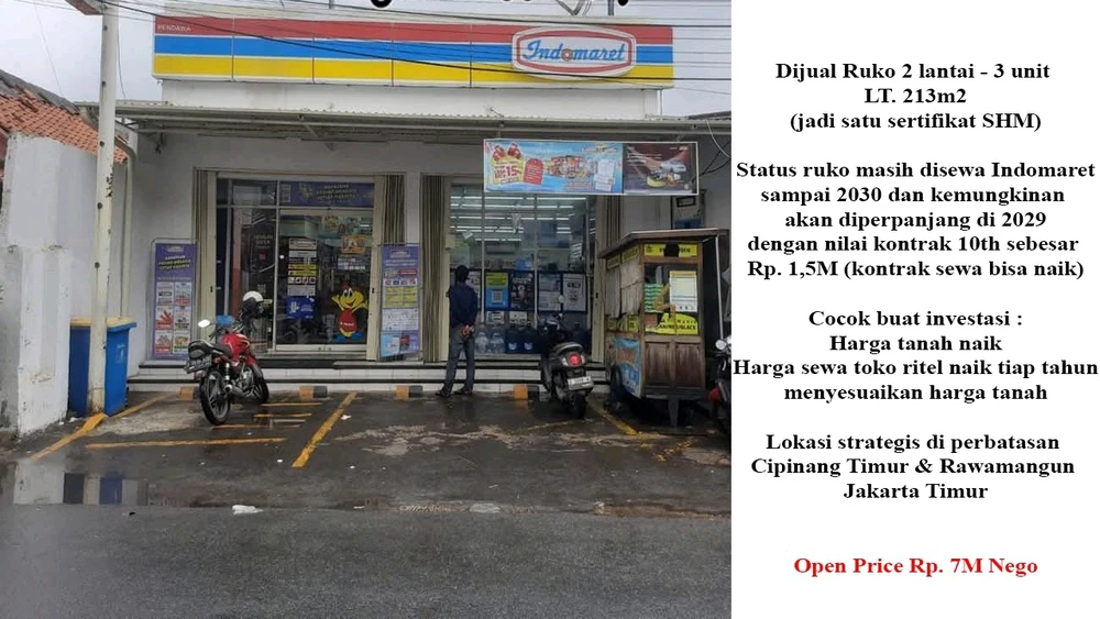 Ruko 3 unit (jadi satu sertifikat SHM) LT. 213m. Open price Rp. 7M (nego) Status ruko masih disewa Indomaret sampai 2030 & bisa diperpanjang oleh pemilik baru di 2029 dengan nilai kontrak 750jt/5th atau 1,5M/10th (ROI 2,14%). Maintenance & asuransi bangunan selama disewa ditanggung oleh... (diedit) baca selengkapnya