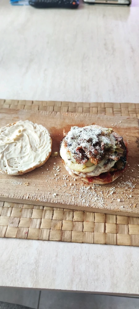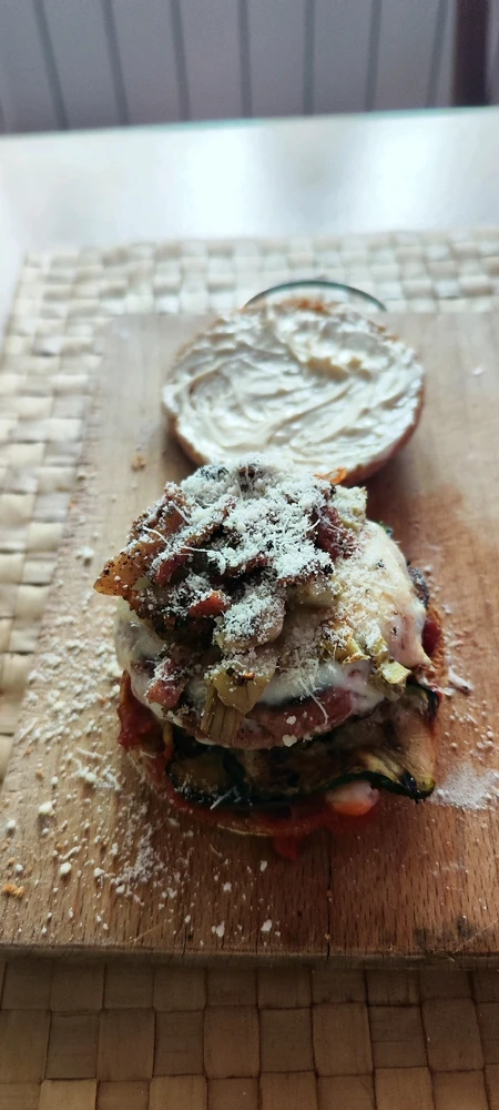 Hamburger Vegano composto da Formaggio Emmental e Sottiletta fila e fondi con mozzarella continuando accompagnato da melanzane e zucchine grigliate e gamberetti 🍤 . Proseguendo con cubetti di carciofi cotti con sopra guancia arrosolato con pepe misto ai 4 colori sfumato con vino bianco e... leggi di più