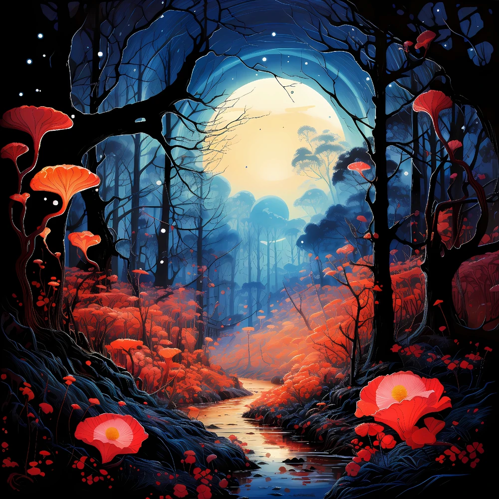 Ai artwork about a moonrise over a fantasy forest