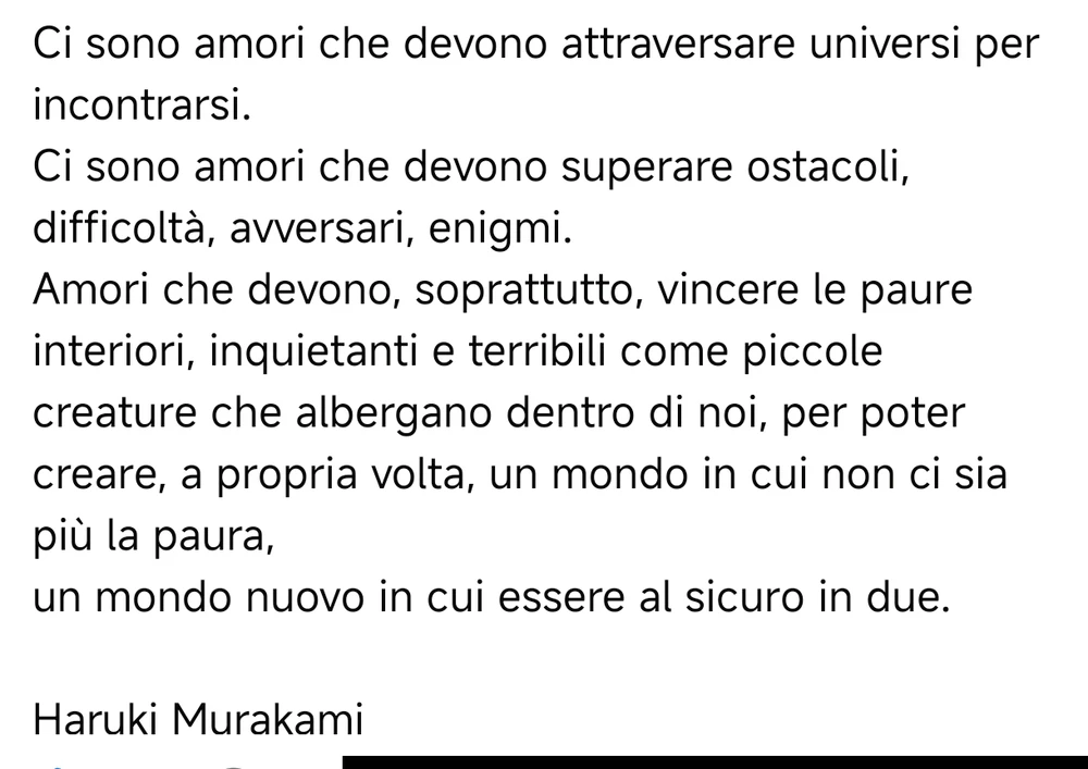 Intanto vorrei dire che il doppio tag dovrebbe essere tra le features di Boo. Comunque... Di solito i pensieri apodittici sull'amore non mi entusiasmano, però Murakami qui restringe il campo, sembra dire che ne esistono di questa qualità, evitando di parlare di un amore universale. Quindi raccolgo... (modificato) leggi di più