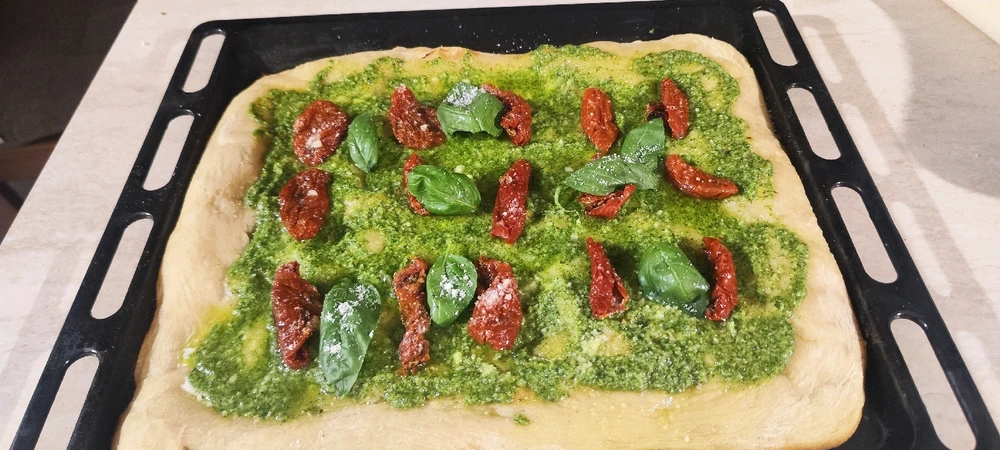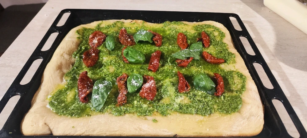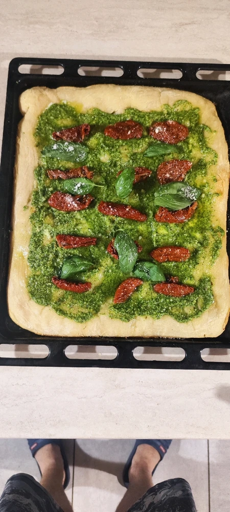 "Tuscan Sunset" - suggerisce la combinazione di colori dei pomodori secchi e del pesto di rucola.🤗 Fatta in Casa , Cotta sul Barbecue ! . "Pizza in teglia morbida con mozzarella di bufala cremosa, pesto di rucola fresco e aromatico, pomodori secchi intensi e saporiti, basilico fresco e fragrante,... leggi di più