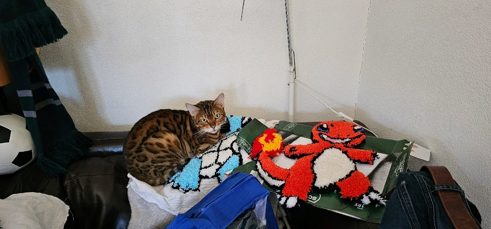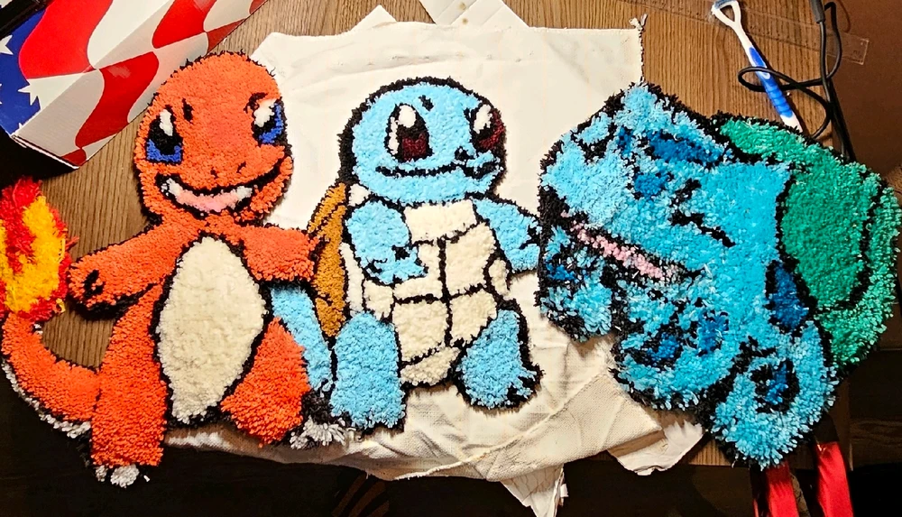 Got the colours for bulby with my tuft device, ran out of the right colour green,so finished his face with a new one (also didn't calibrate my tool so he looks a lot worse). Decided I had to complete the set with charmander and best boi squirtle (Also a bonus surprise)(besut)