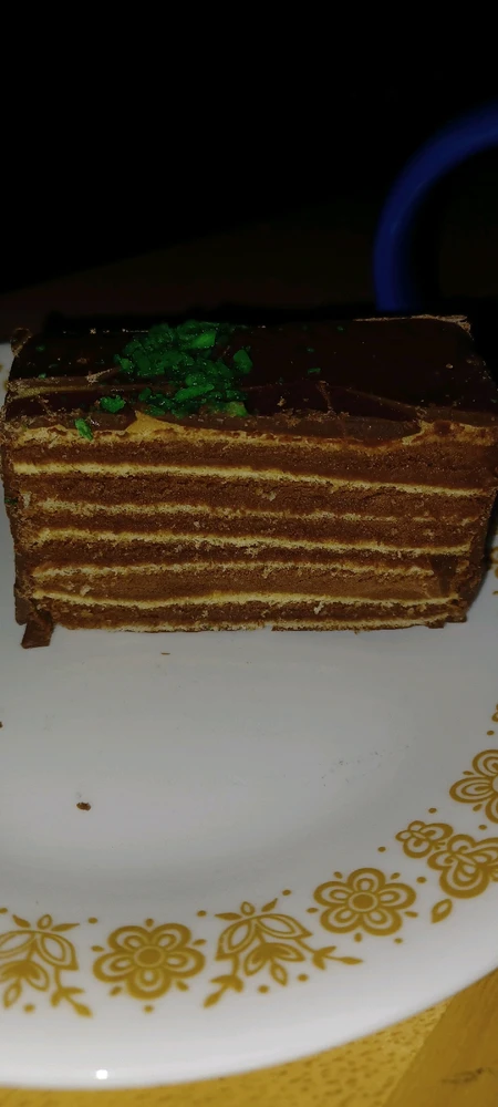 Ending the year with a chai with whipped cream and cinnamon and a chocolate dobosh torte