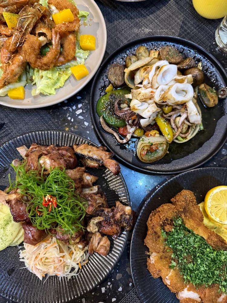 Pork cutlet, grilled squid, baby back ribs, and mango shrimp salad 🫶