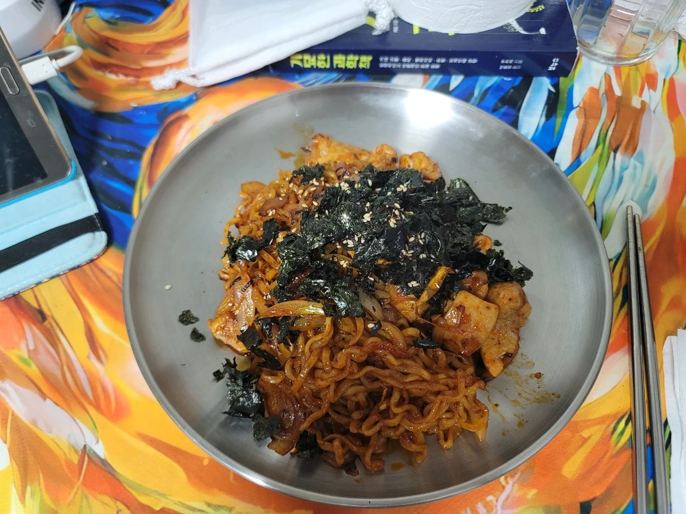 불닭볶음면 내 취향버전! 양파랑 닭고기 볶은것에 불닭볶음면을 넣고 볶아 먹는것! 김도 푸짐하게 올려줘야 맛있지!! My version of Buldak Bokkeum Myeon! Stir-frying onions and chicken with Buldak Bokkeum Myeon! It tastes better if you add a lot of seaweed!!