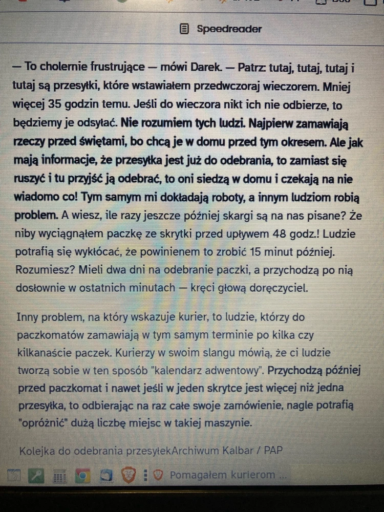 Serio, ostatnio chciałam wysłać dwie duże paczki, kurier był akurat na miejscu i mówi, że sam nie może swoich umieścić, bo ludzie nie odebrali ze wczoraj i wcześniej! I gdyby nie ojciec, który ma auto, musiałabym je taszczyć chyba po jednej do paczkomatu pół kilometra dalej. Onet ma dziś artykuł o... czytaj więcej