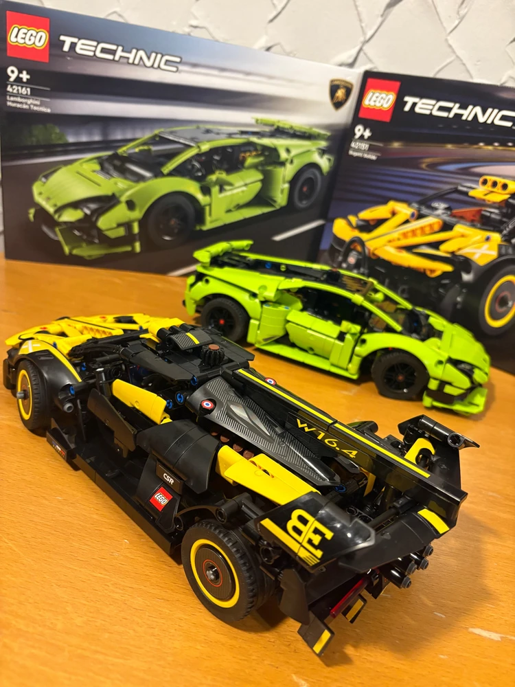 Zestawy Lego Technic nr 42161 (Lamborghini Huracan Tecnica - zielony) i nr 42151 (Bugatti Bolide - żółty).