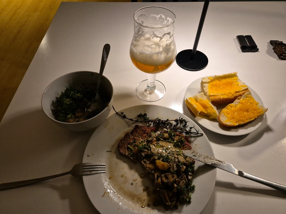I havn't eaten steak for really long time now, so I decided to make one. Here is the result. Served with champignones sauce and cheese bread. What do you think?
