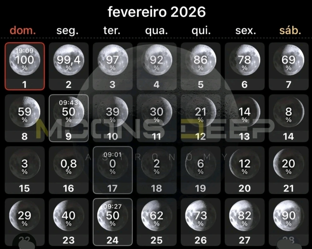 Hoje iniciamos o segundo mês do ano e com ele o calendário lunar com direito a Lua Cheia hoje! *Lua Cheia: 01/02 aproximadamente às 19:13 UTC-3 *Lua Quarto Minguante: 09/02 aprox. às 9:43 UTC-3 *Lua Nova: 17/02 aprox. às 9:01 UTC-3 *Lua Crescente: 24/02 aprox. às 9:27 UTC-3