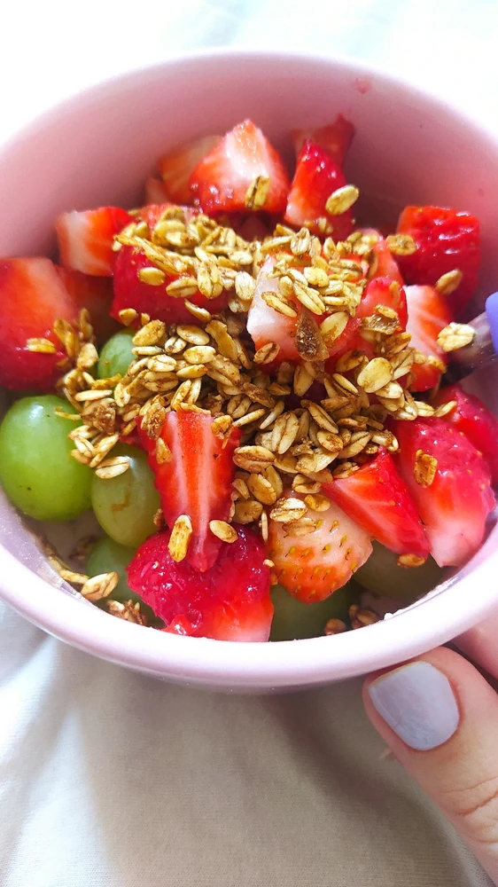 Iogurte natural caseiro com probióticos e Whey Protein + mamão papaya + pêra + maçã + banana + uva + morango + granola zero açúcar. Eu usei Whey Protein isolado da Body Action sabor morango.🤍