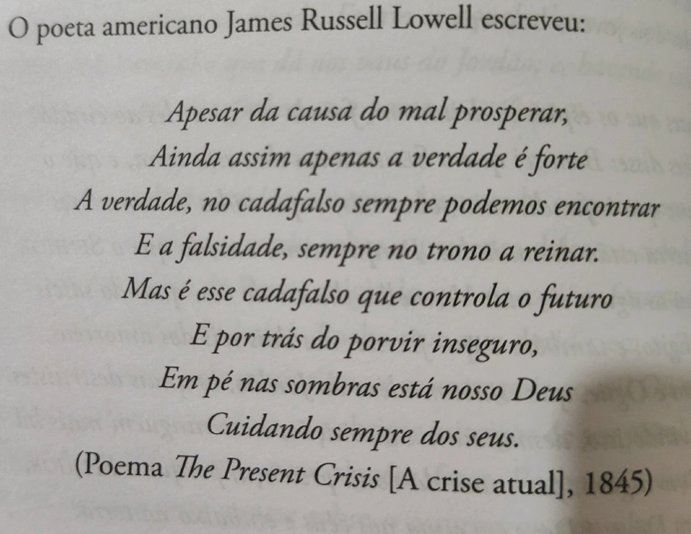 “Apesar da causa do mal prosperar,” Mesmo quando o mal parece estar dando certo, crescendo, dominando. “Ainda assim apenas a verdade é forte” Mesmo frágil, perseguida, a verdade é a única coisa realmente sólida, que aguenta. “A verdade, no cadafalso sempre podemos encontrar” A verdade quase sempre... (editado) ler mais