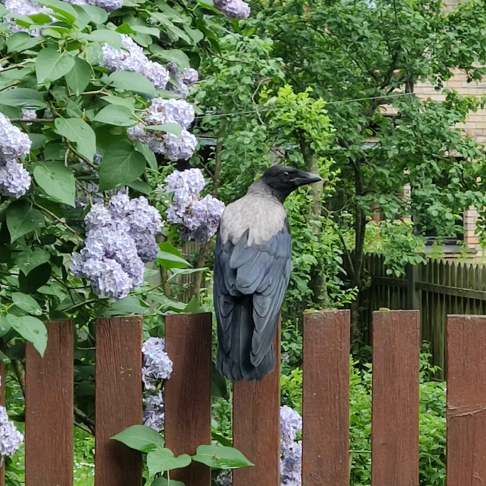 #crow #outdoor #flowers #fence #trees