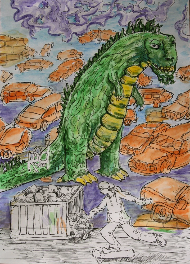 Как то я купил на eBay для ребенка виниловую фигурку Годзиллы. Я долго выбирал, для меня было важно подарить именно аутентичная фигурка. В конечном счёте я остановился на б/у 1995 г. С тех пор она стала участником и свидетеле многих сражений и разрушений. Рисунок: А3, гель, акварель, 2018 г. (изменен)