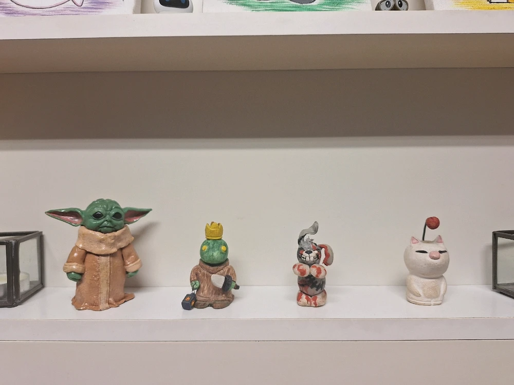 Grogu och Haren är gjord i Polymer lera, Tonberry och Mog är gjord i lufttorkande lera(Tonberry ska målas om och Mog ska ha vingar som gått av - det ska åtgärdas) (redigerad)