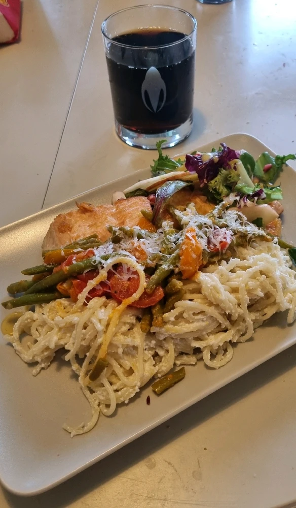 Idag har vi ricotta och citron pasta med färsk lax ångkokad med citron och mynta blad. Vitlöks stekta verts och mini tomter med samma grönsallad som tidigare då jag hade mycket kvar. 😄 Stressade med maten plus en kinkig son så upplägget blev verkligen inte bra denna gång.🤔 (redigerad)