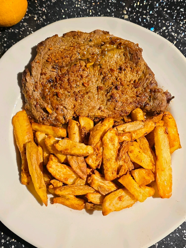 Steak and homemade chips. (Yes I called them "chips" because they were chunkier than fries.. boiled the potatoes first, then cut then out, unevenly 🥲, before airfrying them) the spices are different to my usual, not so spicy. (edited)