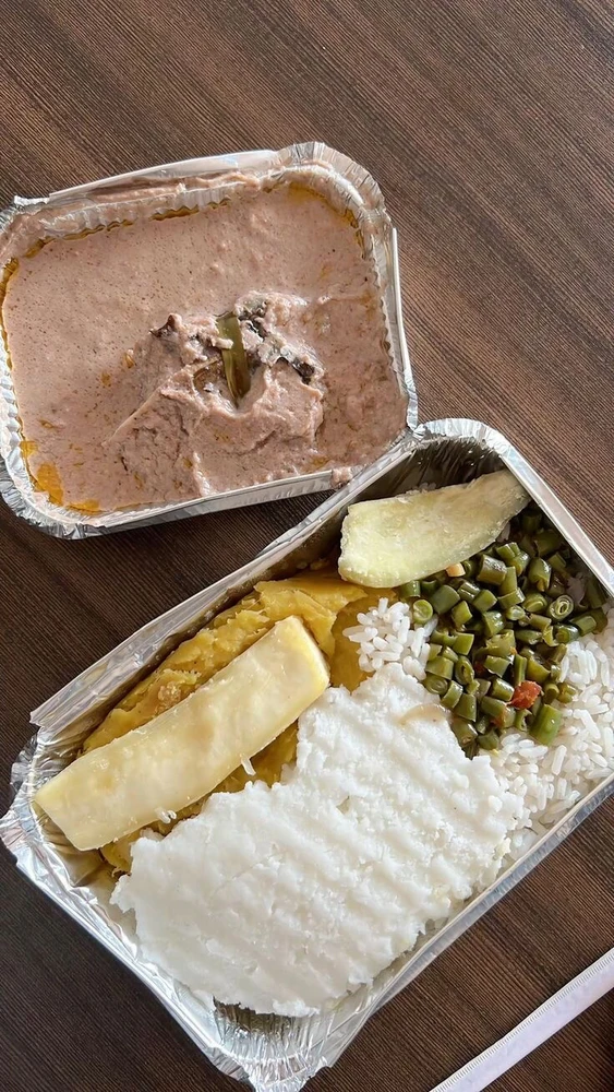 Steamed and pressed bananas in banana leaves “matooke”, cornmeal “posho/ugali”, rice, cassava, sweet potato, vegetables “French beans” and sauce: groundnuts stew.