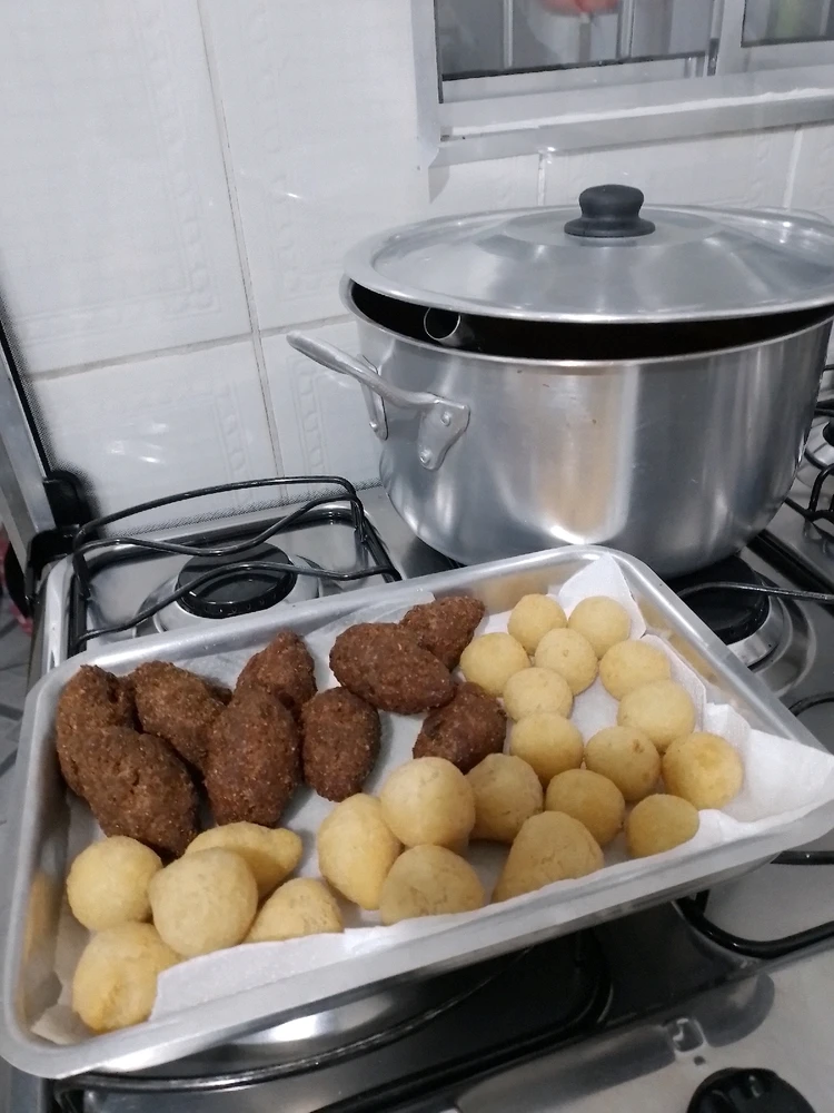 This is Brazilian fast food. Kibe, coxinhas and bolinhas de queijo. Kibe is made with meat and wheat (Has Arabic origins though, but it's popular in here) coxinha is a dough with chicken inside and bolinha de queijo has cheese.