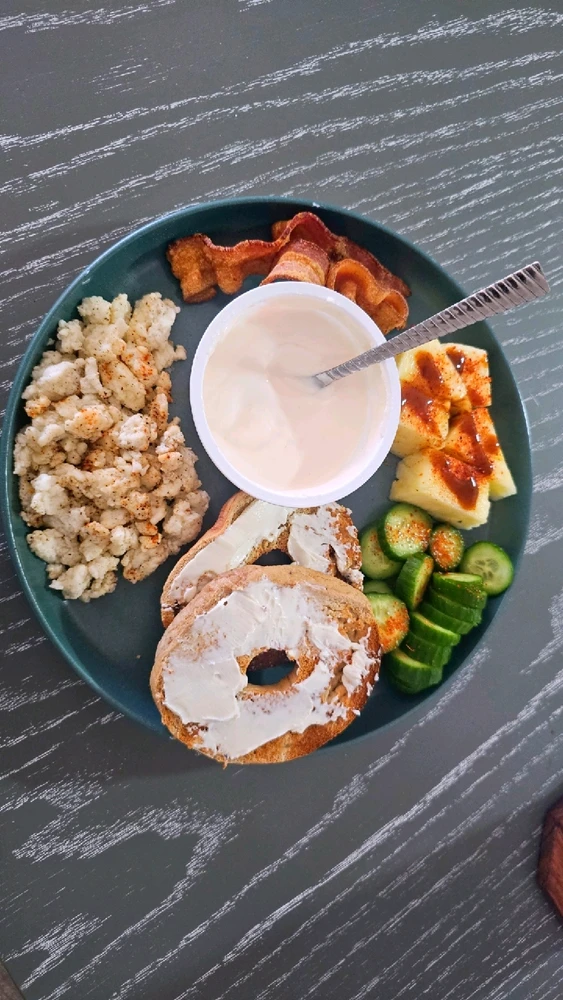 Sola Bagel 14g protein + 29 fiber Zero Sugar Greek Yogurt (Peach) 12g protein Egg whites (will add hot sauce, I don't like eggs) Bacon (Rare but loved) Pineapple with light tajin and Chamuy (because I had a craving) Cucumber 40 oz water (stay hydrated my friends) I do not want to go to the... read more