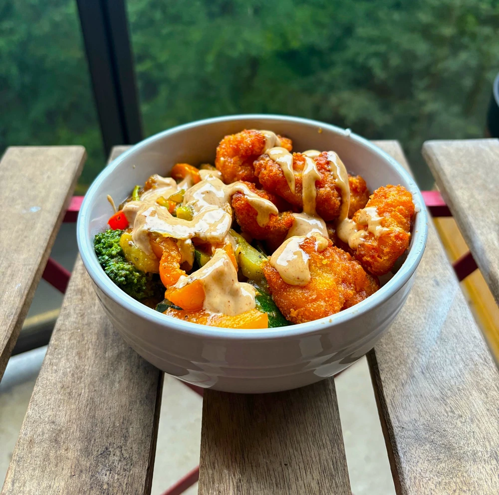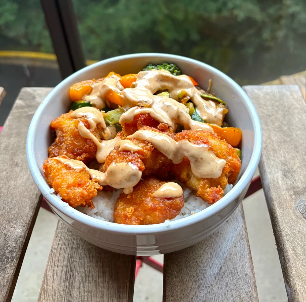 A healthy mix of veggies with air fried chicken all on top of a bed of rice with a drizzle of a house made sauce