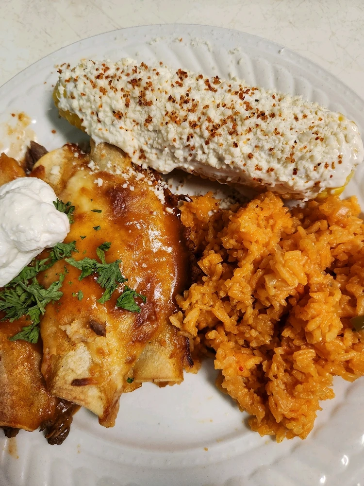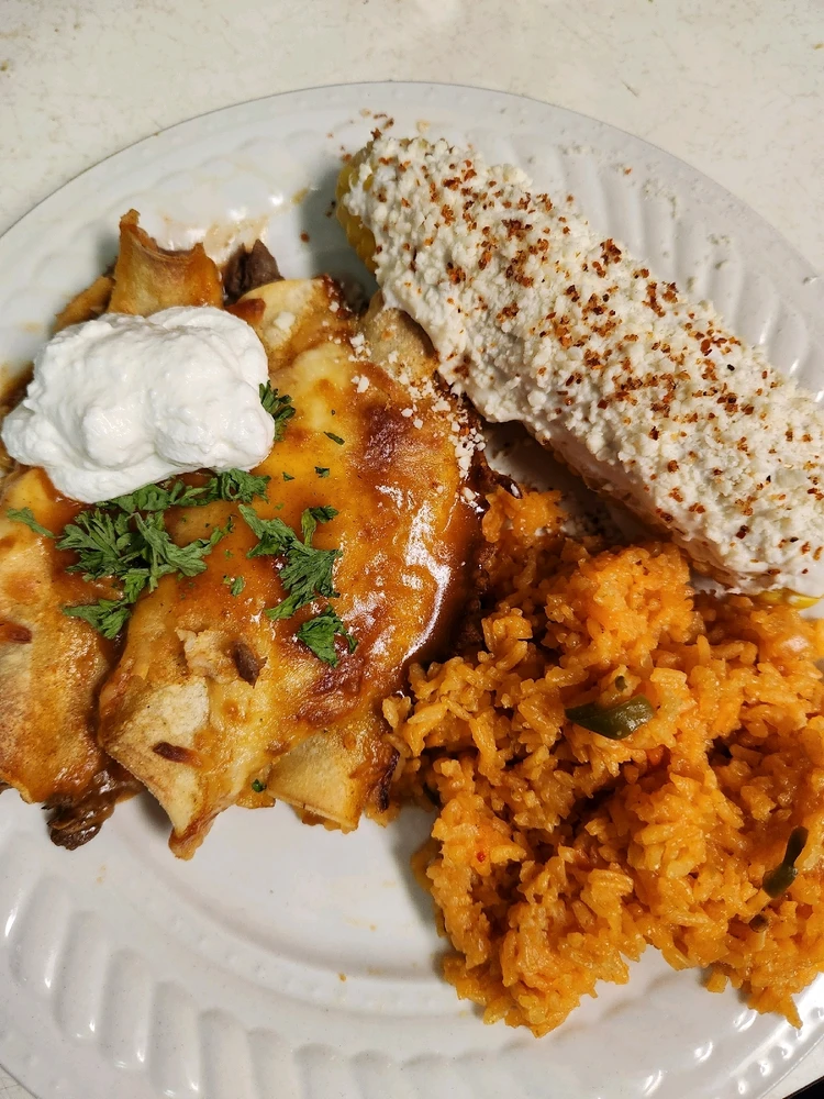 Venison enchiladas with rice and elote