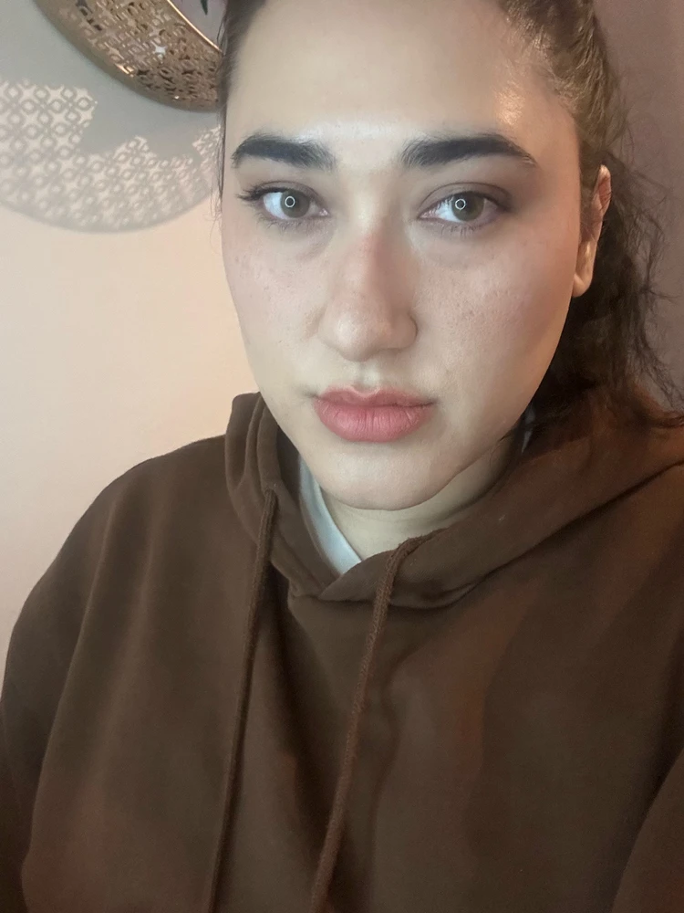 Messy hair and eyebags.