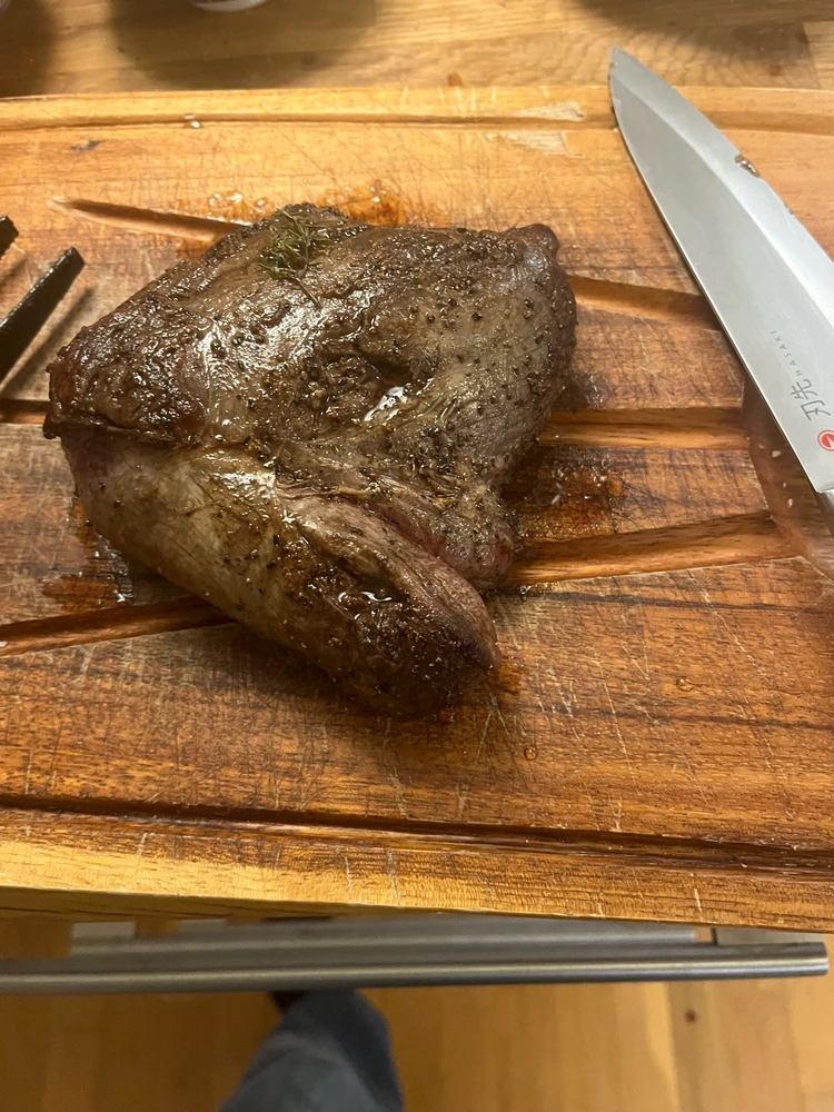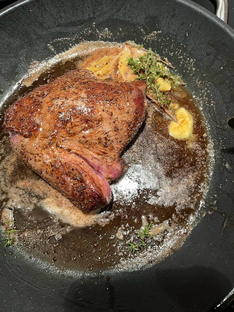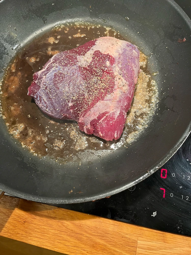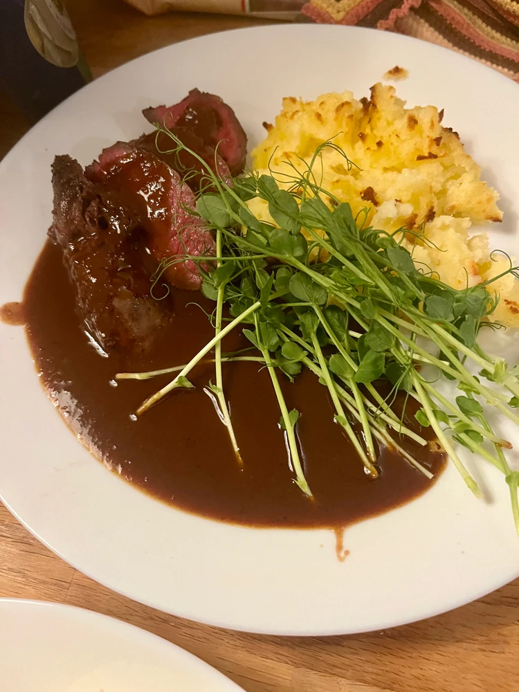 3rd time I cook with venison. Braised it, made a red wine reduction and baked some mashed potato in the oven. 8/10 result on doneness, due to not separating the different parts. 10/10 flavors and eating experience.