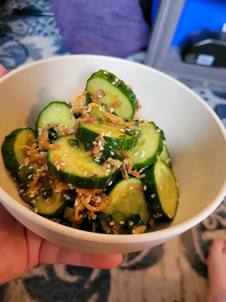 Thin cut potatoes dipped and brushed with a salty duck fat cream, baked, compressed and then air fried. Topped with sour cream, gochujang onion jam, and chives. It was originally gonna be bacon jam, but I burnt it lol. (edited)