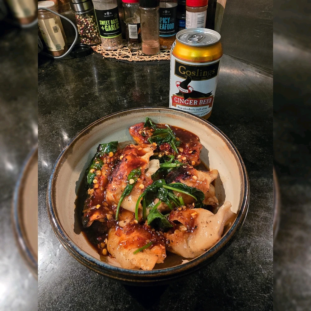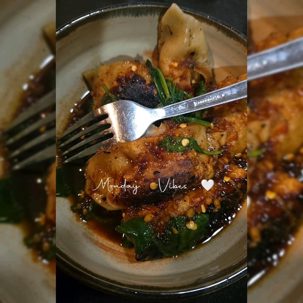 Pan-fried potstickers and baby spinach in garlic chili ponzu with a Goslings.