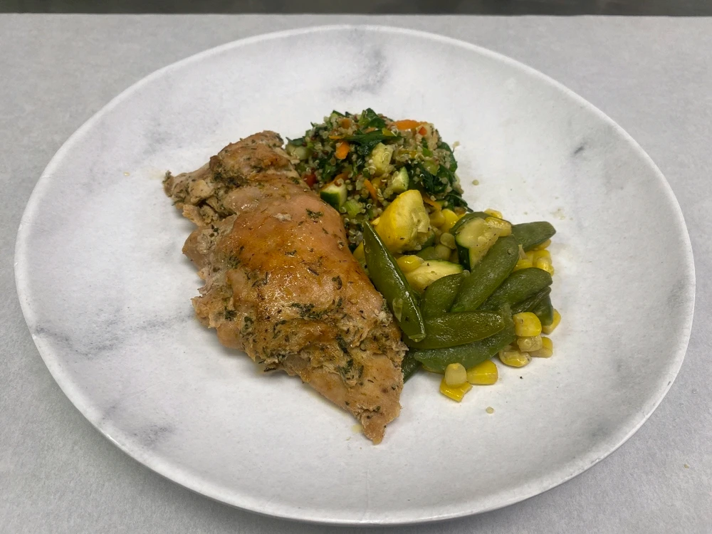 Grilled chicken with mixed veggies and quinoa salad.