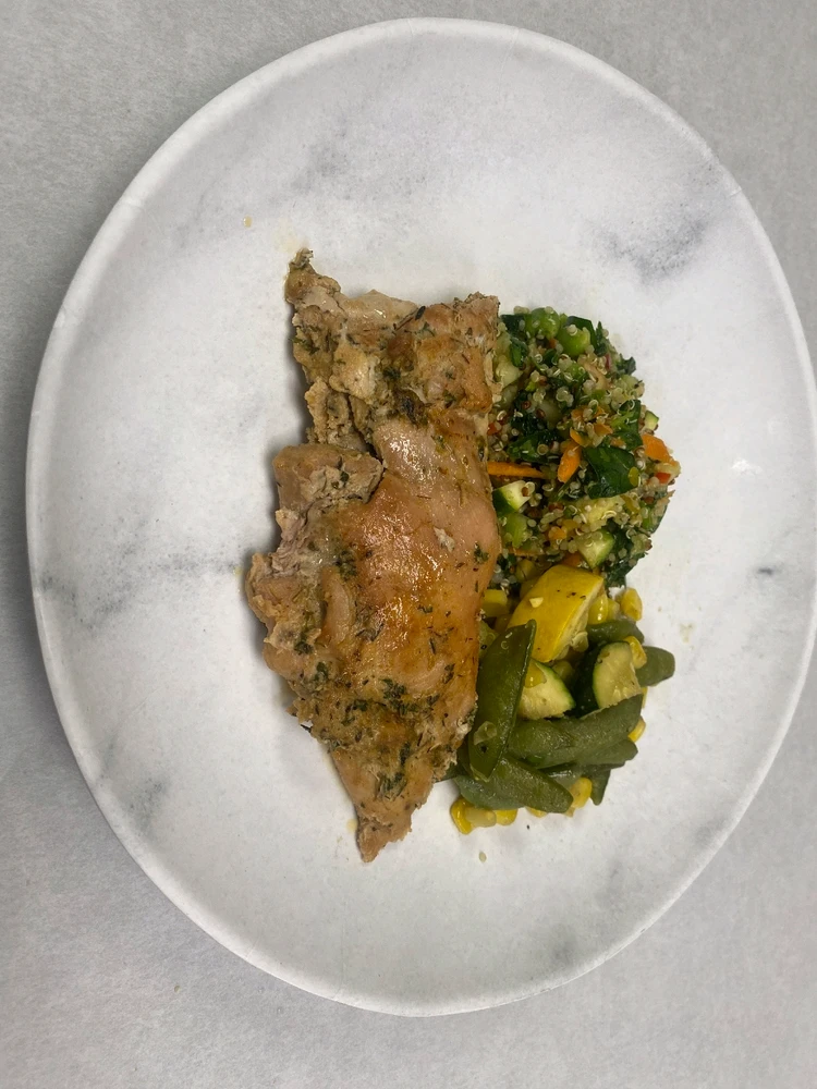 Grilled chicken with mixed vegetables and quinoa salad. I know chicken looks nasty and dry, but it's tender and juicy.