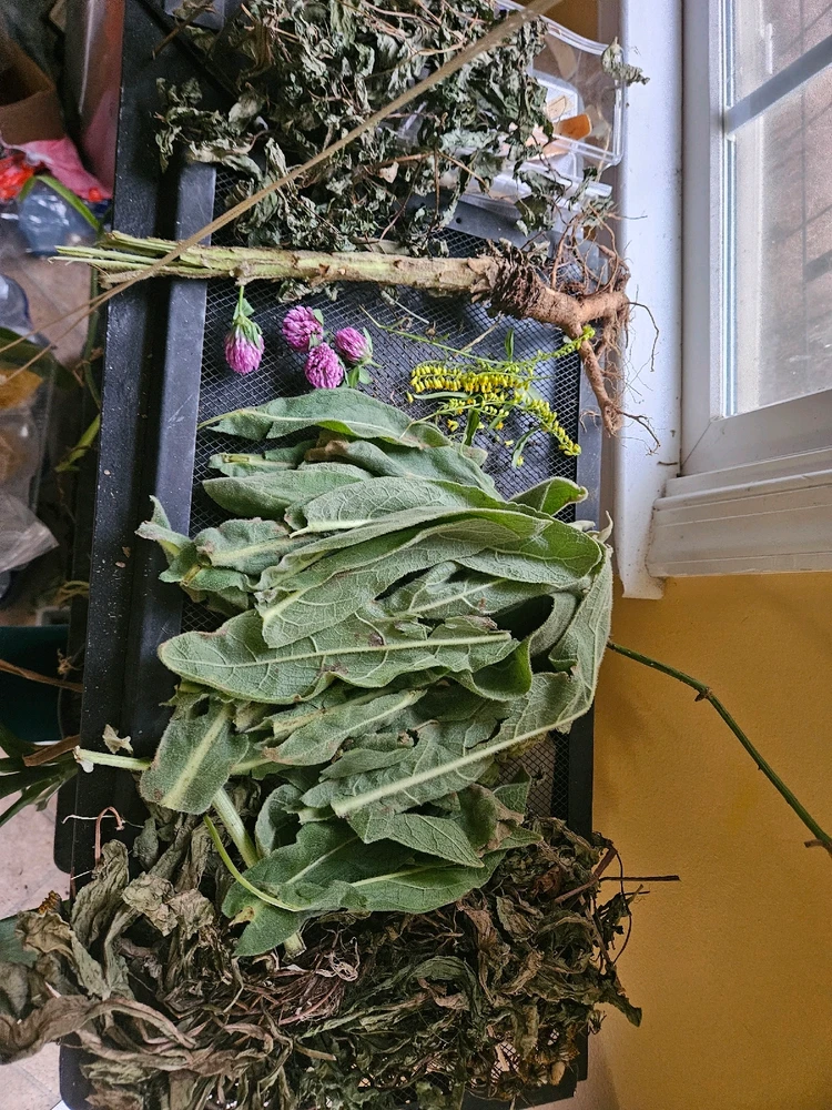 My drying rack. Left to right is all wild: mint, mullein root, goldenrod, red clovers, mullein leaves, dandelion root, dandelions
